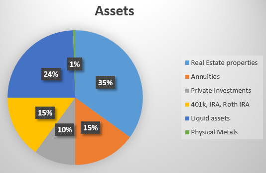 - Real Estate properties that generate income and allow me to cover the expenses on my primary residence (plus some extras, including price appreciation) - 35% of total investment.