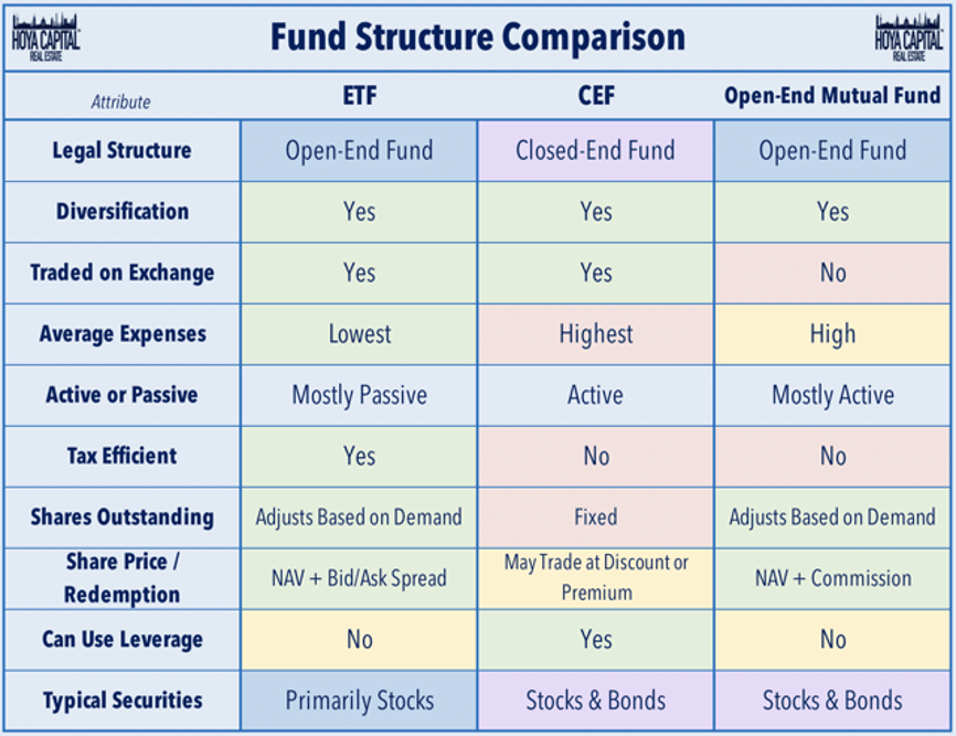 Real Estate CEFs typically hold a wider range of securities than ETFs, including preferreds, bonds, and other investment vehicles. For comparison of ETFs, CEFs, and mutual funds, please look at the following table from Hoya Capital: