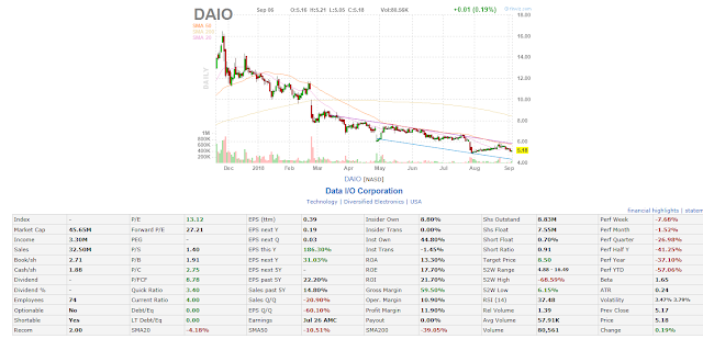 The valuations for DAIO stock (in the picture below) are quite good: no debt, great EPS and P/E, enough cash, respectable ROE, yet the company lost 57% YTD (Finviz.com)