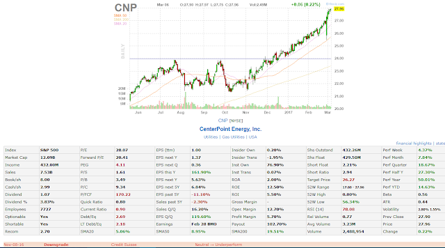 Even a respectable company like Credit Suisse has failed to predict the stock performance. Let’s take a look at CenterPoint Energy, Inc. (CNP). The stock was downgraded from Neutral to Underperform (!) on November 8th, 2016, when the price was $23.41 at the opening. This “underperforming” stock has gained 19.4% by March 6th.