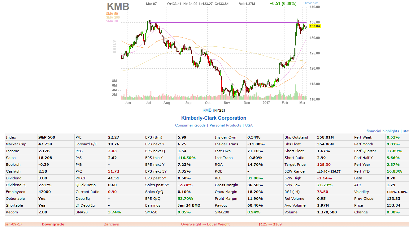 And one more (I promise this is the last example): Kimberly-Clark Corporation (KMB) was downgraded by Barkleys on January 9th from $125 to $109 when the stock was at $114.64. As you can see below, the stock extended to $133.64, which represents a ~16.6% gain.