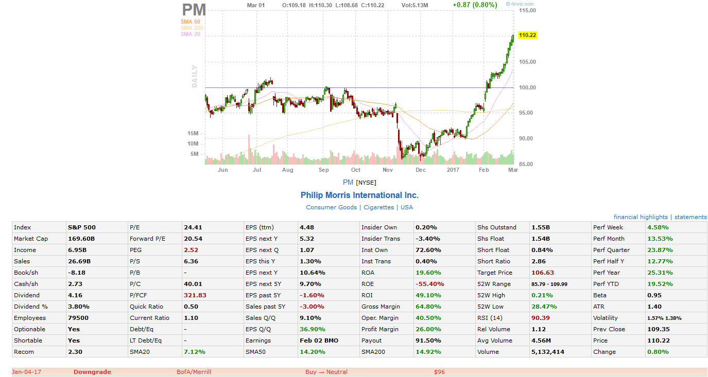 Let’s start with well-known stocks. Philip Morris International (PM). At the bottom of the chart, you may find the downgrade of the stock issued by the well-known financial organization BofA/Merrill. The date of rating: January 4th, 2017, when the stock was at $90.42. Let’s take a look at the chart. For the less than 2 months since the recommendation, the stock gained $19.8 (at $110.22), which corresponds to a 21.9% gain.