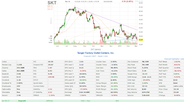 The next chart is Tanger Factory Outlet Centers (SKT). Bob Smart (Jefferies, in this case) was obviously excited to see the jump from $35 to $36.73 within a few days (end of December –until January 3rd). So, naturally, he has upgraded the SKT from Hold to Buy with a target of $42. Guess what? Within two months, the stock lost $3.55, which corresponds to a 10% loss.