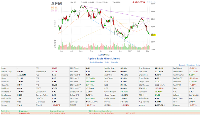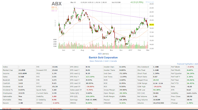 The next stock is Barrick Gold Corporation (ABX). The stock was downgraded on December 21st, 2016, by TD Securities when the stock was at $14.6. Let’s take the same two-month period and look at the value of the stock on February 21st$20.11. The stock has added $5.11, which represents a 37.7% gain!