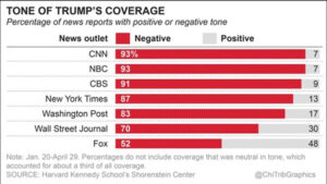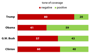 According to Harvard professor Thomas Patterson, “Trump’s coverage during his first 100 days set a new standard for negativity. Of news reports with a clear tone, negative reports outpaced positive ones by 80 percent to 20 percent. Trump’s coverage was unsparing. In no week did the coverage drop below 70 percent negative, and it reached 90 percent negative at its peak.”