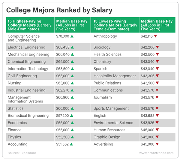Glassdoor (a job recruitment company) found that nine of the 10 highest-paying majors were male-dominated. By contrast, six of the 10 lowest-paying majors were female-dominated.