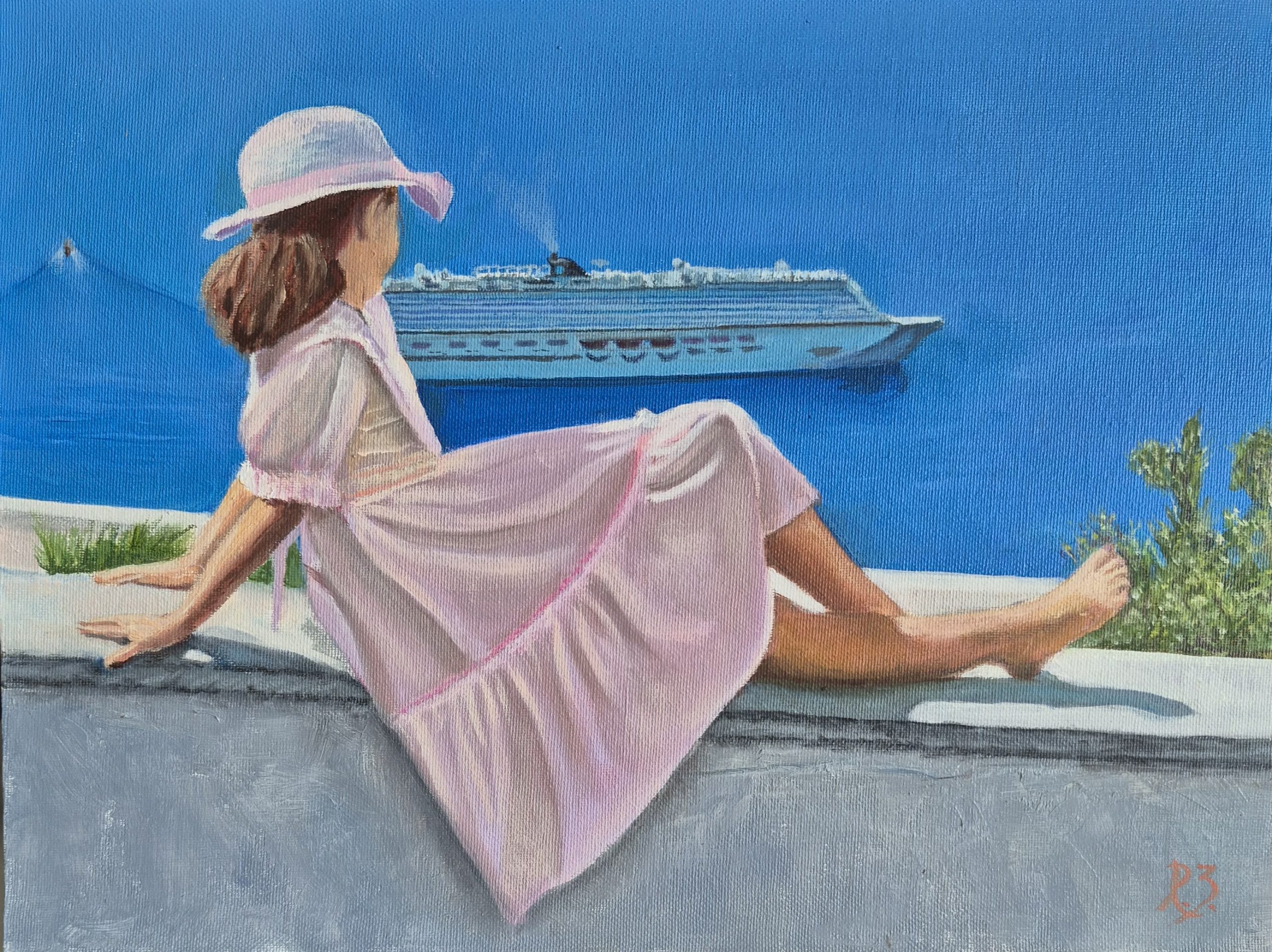 “The dream of Santorini”. Oil on board, 13×18. Available for commission.